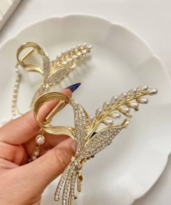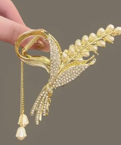 کلیپس مو مجلسی خوشه گندم از بهترین کلیپس موهای مجلسی به شمار می رود. این کلیپس مجلسی آویزدار است. پایه این کلیپس مو فلزی است. دیزاین این کلیپس مو مجلسی از مروارید و نگین است. تزئین دسته کلیپس از نگین و دانههای گندم ازمروارید است. سایز این کلیپس مو بزرگ است. به همین دلیل برای موهای بلند و پرحجم و حجم متوسط مناسب است. بدنه کلیپس آبکاری شده و ماندگاری رنگ بسیار عالی دارد. کلیپس مو مجلسی خوشه گندم مخصوص مراسمها، جشنها و مجالس است. اگر به دنبال فقط یک کلیپس مو مجلسی شیک و با کیفیت هستید پیشنهاد ما این کلیپس است. نمونه دیگری از کلیپس خوشه گندم را در [این صفحه] حتما ببینید. برای مشاهده انواع کلیپس مو مجلسی [این صفحه] را هم از دست ندهید و مشاهده بفرمایید. برای انواع کلیپسهای روزانه و مجلسی با تنوع بسیار بالا هم [این صفحه] در انتظار شماست.