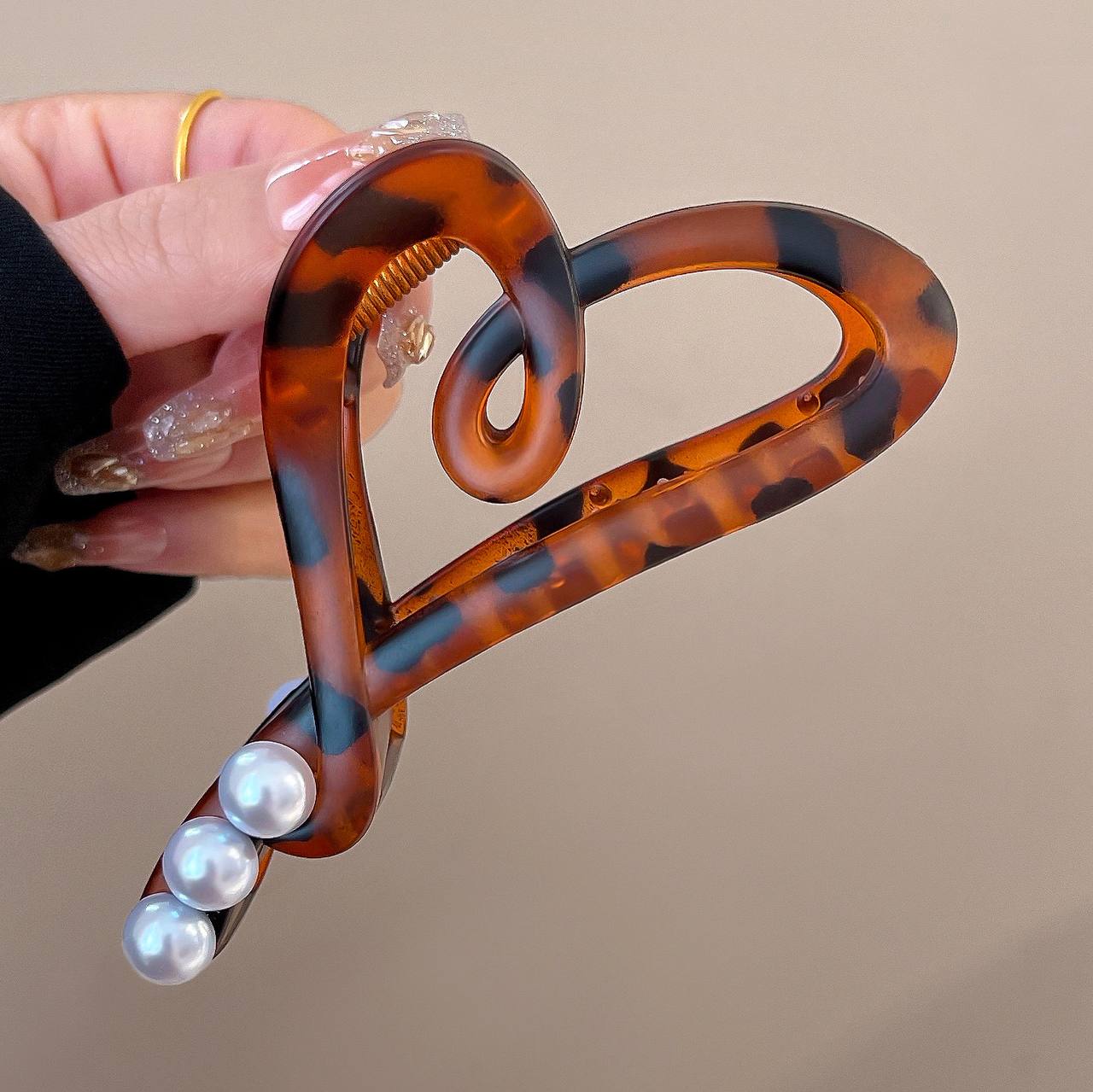 کلیپس مو پلنگی مرواریدی با طرح قلب و رنگبندی نود گزینهای عالی برای استایلهای شیک است. این کلیپس مو در سایز دوازده سانتیمتر جزء کلیپسهای سوپرسایز به شمار میرود و برای موهای پرحجم، بلند و حجم متوسط مناسب است. رنگبندی این کلیپس تم قهوهای با طرح پلنگی و در دو طیف قهوهای کم رنگ و قهوهای پررنگ است. کلیپس مو پلنگی مرواریدی هم برای استفاده روزانه وهم برای جشنها و مراسمها و مجالس مناسب است. این کلیپس برای طرفداران استایلهای شیک همان چیزی است که دنبالش هستند. برای سایر نمونههای کلیپس پلنگی در طرحهای مستطیل و هلالی حتما به [این صفحه] و برای دیدن نمونه فانتزی دیگری از کلیپس ها به [این صفحه] مراجعه کنید. برای مشاهده بیش از دویست مدل کلیپس [این صفحه] را ببینید.