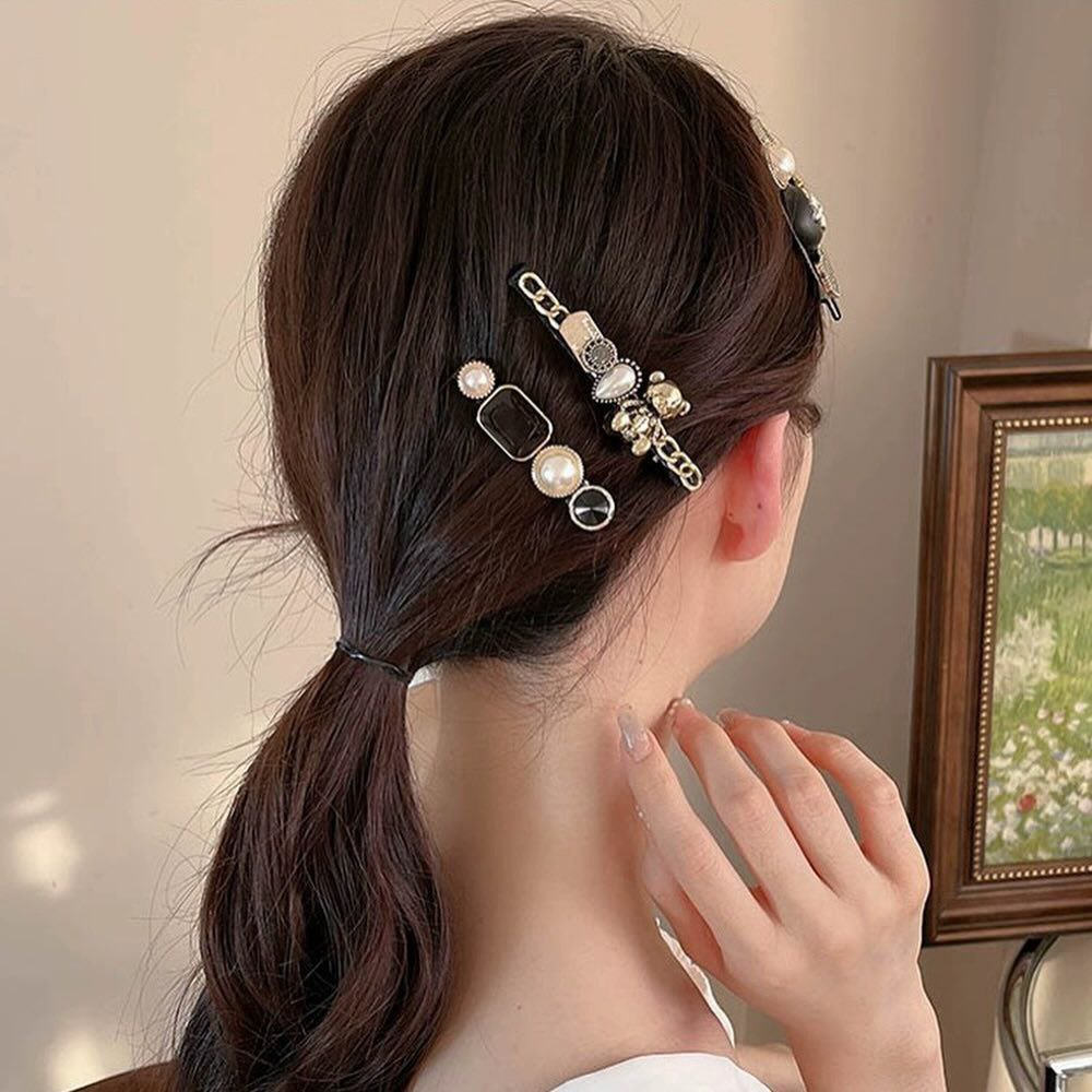 پک گیره مو مرواریدی مشکی از ستهای مجلسی شیک و جذاب محسوب میشود. تعداد گیرههای این ست پنج عدد است. سایز گیره موهای مجلسی این پک بین پنج تا هفت سانتیمتر است. پایه گیره موها فلزی و دیزاین گیره موها از مروارید، نگین و سیلیکون است. تم مشکی این گیره موها در مراسمها و جشنها و مجالس جلوهای بسیار لوکس و مجلسی به استایل شما میبخشد. همچنین پک گیره مو مرواریدی مشکی برای مصرف روزانه نیز بسیار مناسب است. جنس باکیفیت و گیره محکم این گیره موها موهایتان را بدون آسیب و با ثبات کامل در جای خود نگه میدارد. اگر به دنبال گیره مو مجلسی، اکسسوری مو شیک، یا گیره مو فانتزی دخترانه هستید، این ست کامل میتواند بهترین انتخاب برای تکمیل استایل شما باشد. همچنین نمونه ست ستاره دریایی را در [این صفحه]، ست گیره مو دخترانه طرح قیچی را در [این صفحه] و انواع مدلهای گیره موهای مجلسی را در [این صفحه] حتما ببینید.