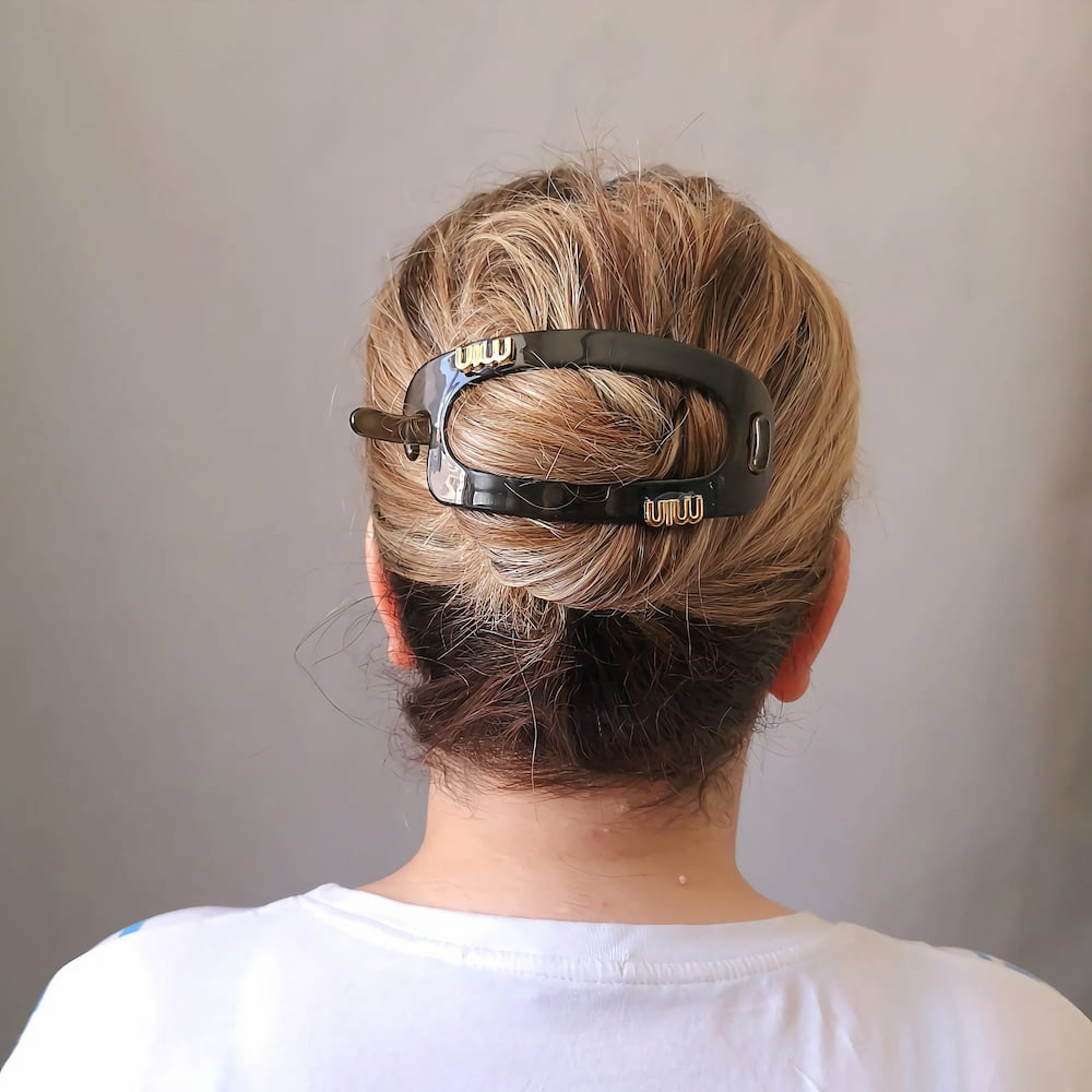 گیره مو چفتی پلی استر برند مین از جدیدترین گیره موهای چفتی برای پشت موها است. این گیره مو نشکن در سه رنگ دودی، سفید و قهوهای تولید یکی از بهترین برندهای اکسسوری مو در دنیا برند min است. سایز این گیره سر سوپر سایز است. طول آن دوازده سانتیمتر و عرض آن پنج سانتیمتر است. این گیره مو چفتی به دلیل ابعادش برای موهای پرحجم، بلند و حجم متوسط مناسب است. فنر بسیار محکمی دارد. وزنش سبک است به همین دلیل اگر به مدت طولانی روی مو بماند نه تنها وزن آن احساس نمیشود بلکه به کف سر هم فشار وارد نمیکند.